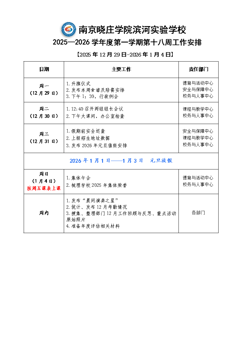 2025-2026学年度第一学期第十八周工作安排